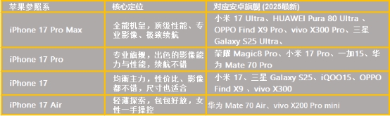 下面的表格以iPhone 17系列为锚点,为你精准匹配在目标价位、产品定位或特色功能上相似的安卓热门机型。