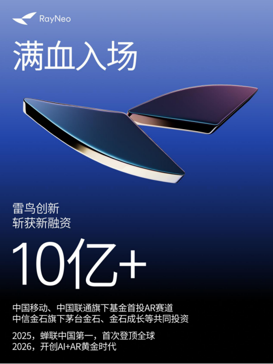 2026年1月5日——全球领先消费级AR品牌雷鸟创新(RayNeo)宣布近期完成新一轮超 10 亿元融资。本轮融资由中国移动链长基金与中信金石(旗下茅台金石、金石成长等基金)领投,中国联通旗下联创创新基金等机构共同参与。