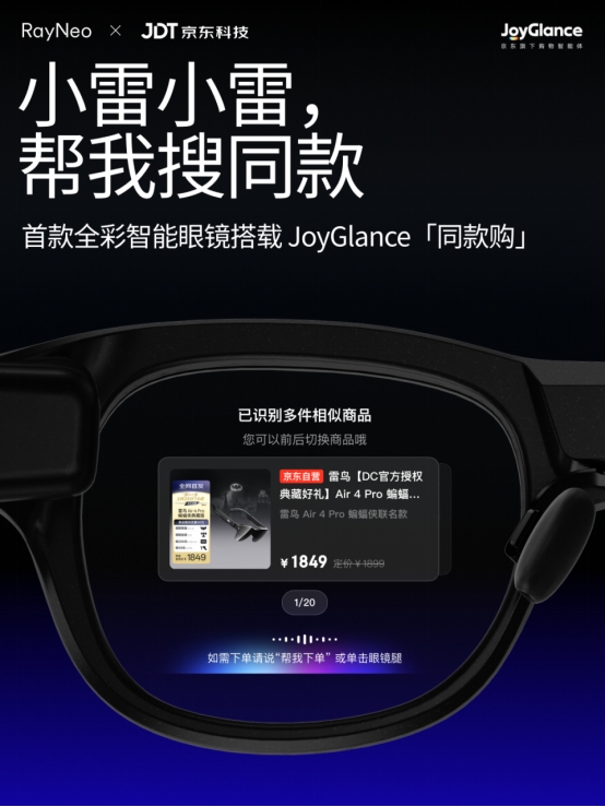 3 月 31 日,全球领先消费级 AR 品牌雷鸟创新(RayNeo)携手战略伙伴京东科技,基于购物智能体 JoyGlance 正式上线全彩智能眼镜应用「同款购」。这是业内首次在全彩屏显智能眼镜端实现从商品发现到支付完成的完整购物闭环,也是双方战略合作后技术能力全面打通的重要里程碑,标志着智能眼镜购物体验迈入全彩时代。